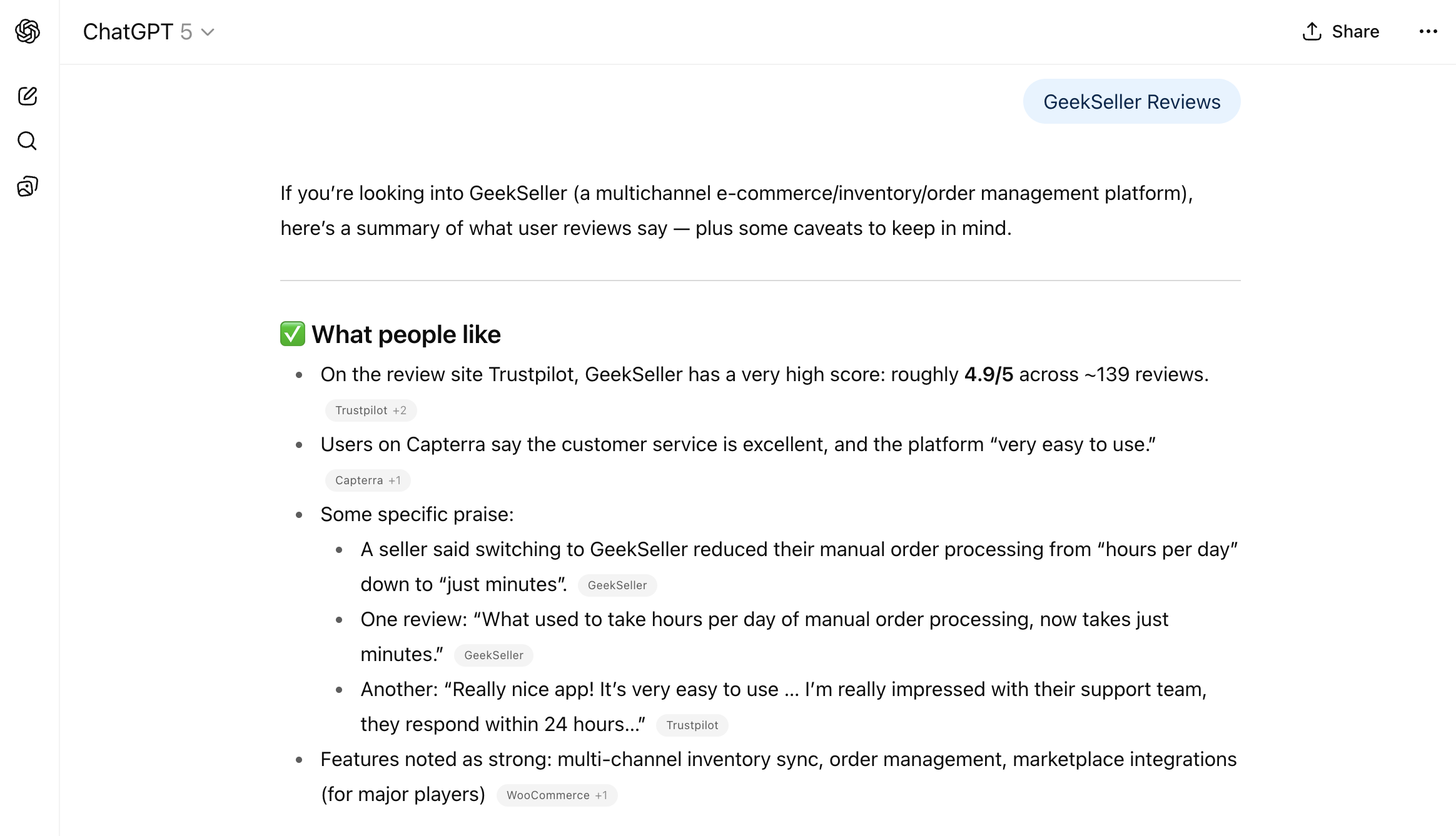 OpenAI’s ChatGPT speaks positively about GeekSeller, noting our reputation as a reliable, innovative eCommerce partner. It highlights our strong industry relationships and the praise we receive from users for our easy-to-use platform and responsive support.