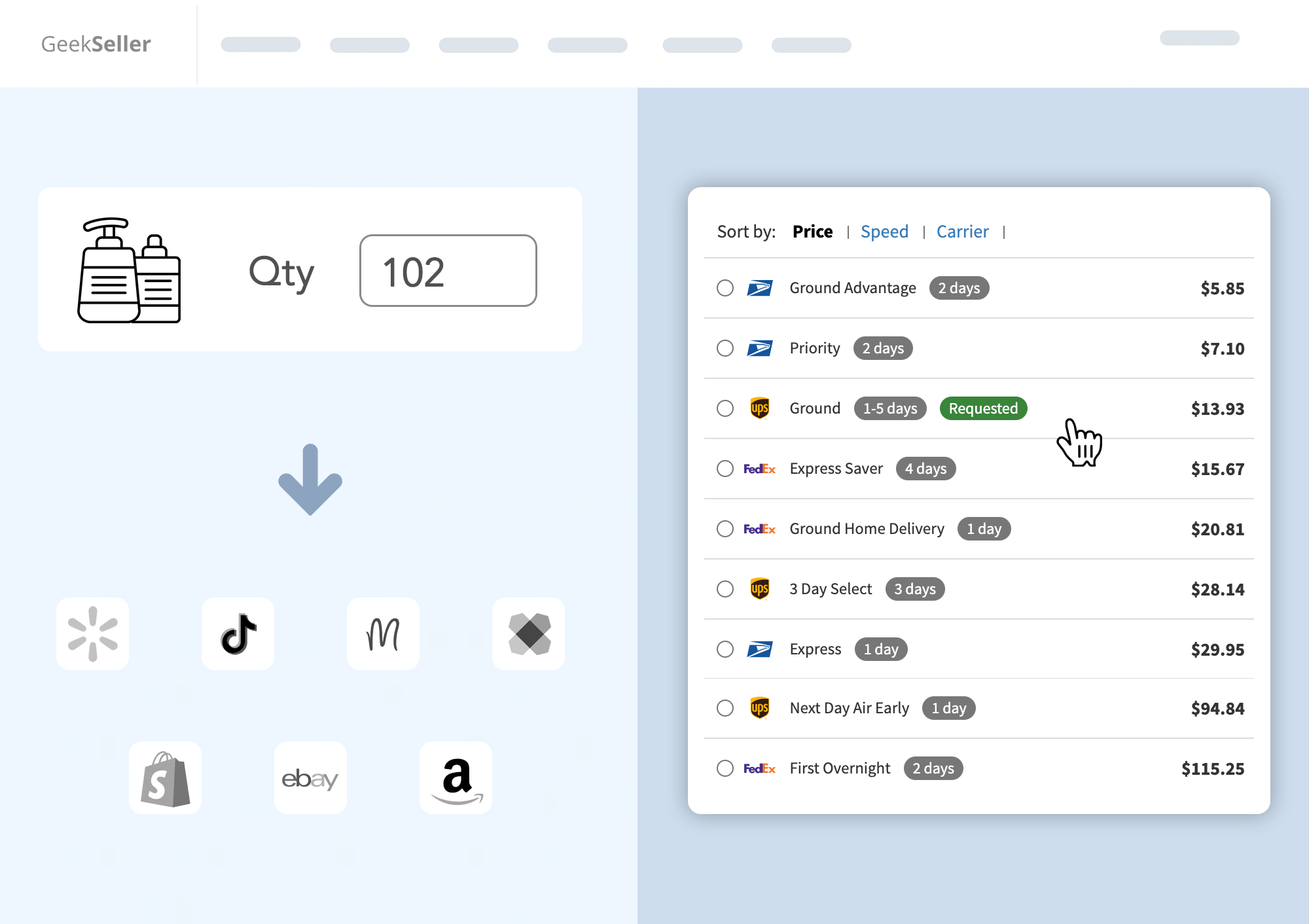Save up to 83% on shipping with pre-negotiated carrier discounts from FedEx, UPS, USPS, DHL and Canada Post — no carrier account needed. GeekSeller, in partnership with EasyPost, lets you compare rates instantly, print labels, and automate order fulfillment.