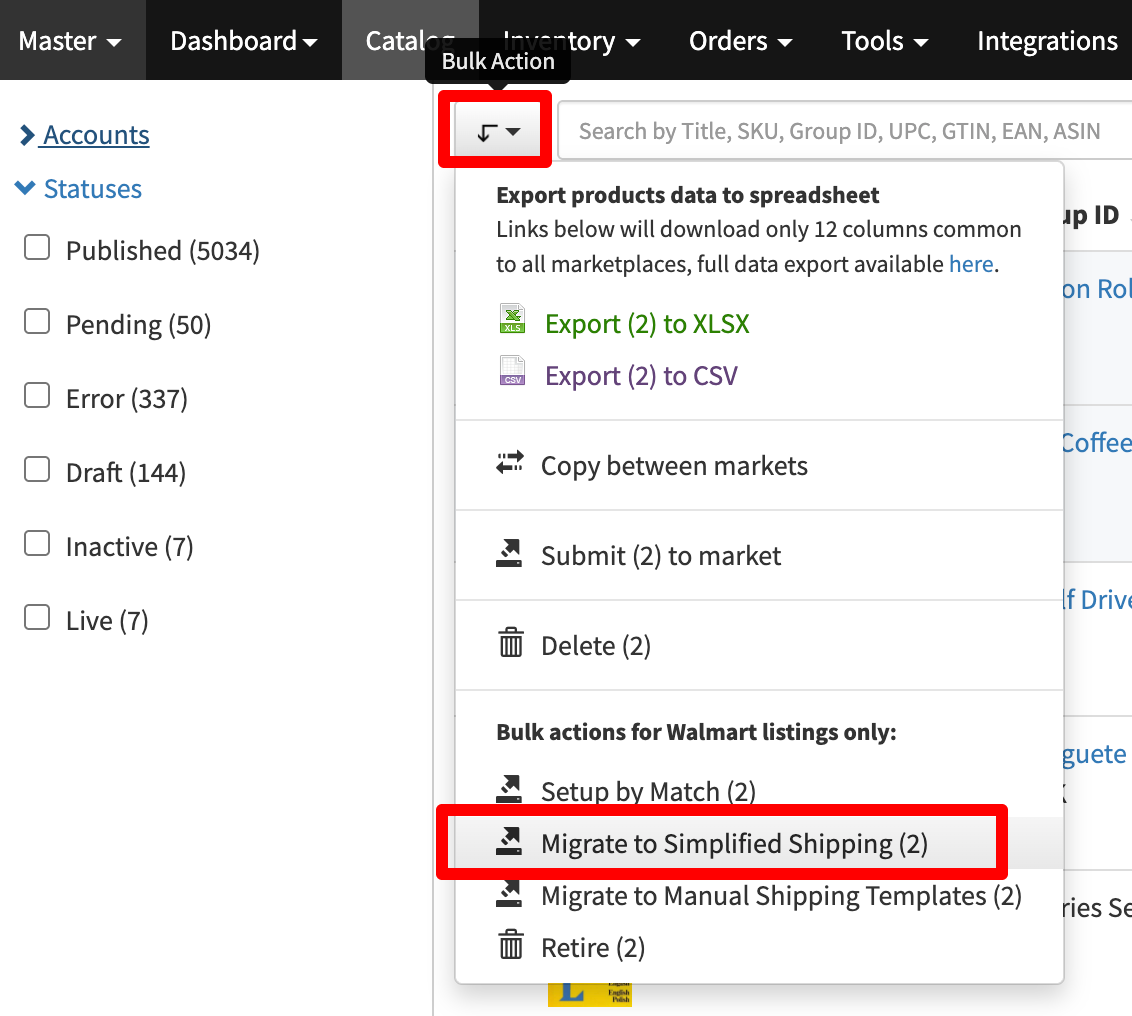 If you want to switch selected products to the new Simplified Shipping Settings, you’ll first need to configure your shipping setup in Walmart Seller Center. Once that’s done, you can use the GeekSeller interface to easily assign products to these new settings. Simply go to your Catalog tab, select the listings you want to update, and from Bulk Action menu choose the Migrate to Simplified Shipping. This way, you manage the setup in Seller Center but control which products use it directly from GeekSeller.