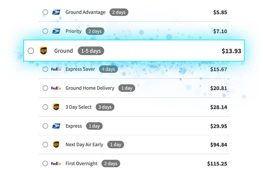 Smart Rates compares real-time carrier rates (such as FedEx, UPS, USPS, etc.) based on speed and cost, then automatically picks the best option according to your preferences.